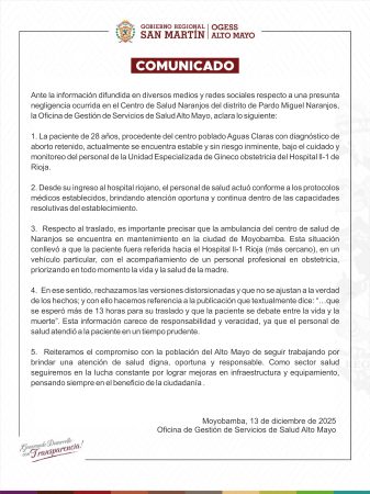 La OGESS Alto Mayo, nos hace llegar el siguiente comunicado en base a un suceso en Pardo Miguel – Naranjos Prov. Rioja