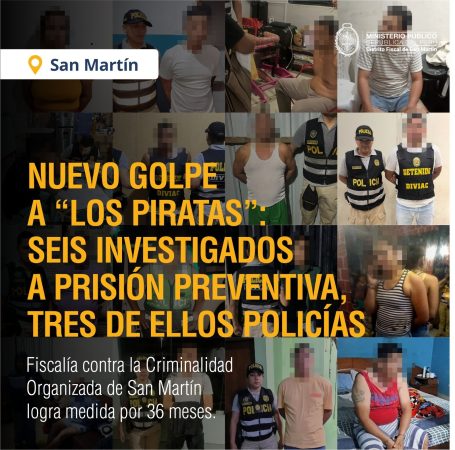 Tres de los investigados son efectivos policiales del Grupo Terna PNP Tarapoto. Previamente, otros cuatro ya cumplían prisión preventiva por esta investigación. (San Martín, 5 de febrero de 2026). – La Fiscalía Especializada contra la Criminalidad Organizada de San Martín logró que el Poder Judicial dicte 36 meses de prisión preventiva contra seis presuntos integrantes […]