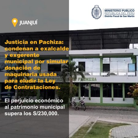 (Mariscal Cáceres, 21 de enero de 2026). – la Fiscalía Anticorrupción de Juanjuí logró que se condene al exalcalde de la Municipalidad Distrital de Pachiza Rosember Hildebrandt y al exgerente municipal Jhimmy López por simular una donación mediante un convenio para adquirir maquinaria pesada que, además, era usada, lo que obligó al municipio a asumir gastos de reparación que generaron un perjuicio económico al Estado superior a los S/230,000.