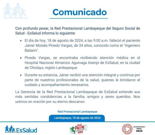 La Red Prestacional Lambayeque de EsSalud comunicó «con profundo pesar» el fallecimiento de Jainer Pinedo, quien se encontraba hospitalizado desde el pasado 21 de julio.